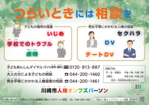 川崎市男女共同参画センターは、「男女平等川崎条例」(2001(平成13)年10月施行)に基づき設置された男女共同参画を推進する拠点施設です。女性のための総合相談(電話相談・面接相談・法律相談)、男性のための電話相談を実施し、家庭や職場の人間関係、生き方、配偶者やパートナーからの暴力(DV、デートDV)、ハラスメントなどの相談をお受けしている他、市内高等学校への出前事業としてデートDV予防啓発ワークショップを実施しています。